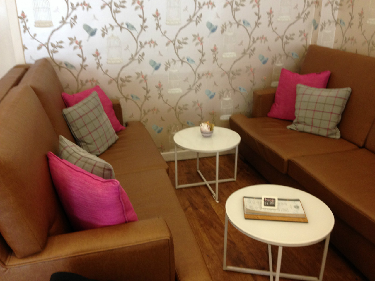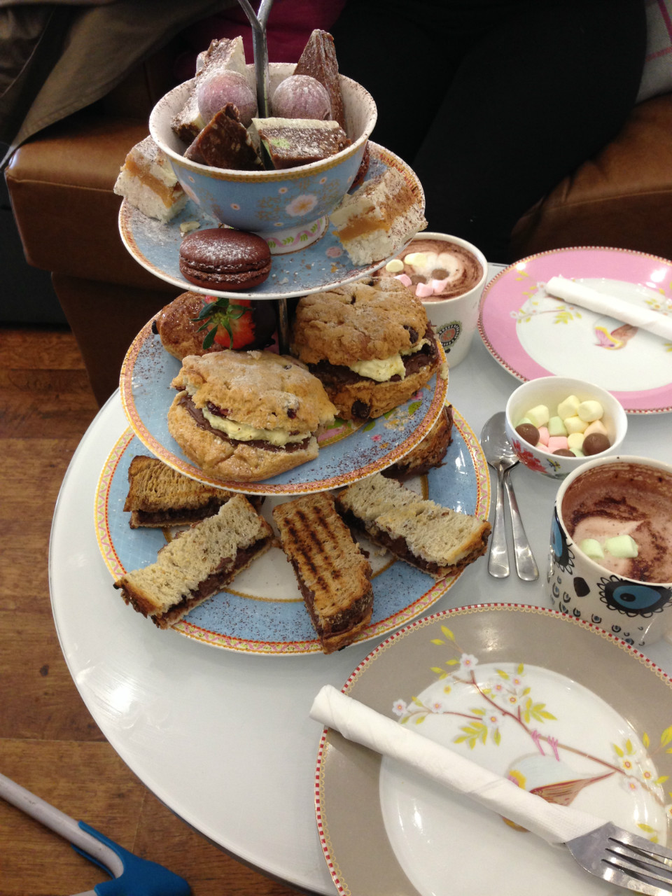 Our drinks arrived promptly and then we didn’t have too long a wait at all before we were presented with our gorgeous afternoon tea! Working from bottom to top, nutella toasties, scones with clotted cream and chocolate, pain au chocolat, chocolate dipped strawberries, macarons, white chocolate crispies, truffles and tray bakes!! Oh my! We happily worked our way through these goodies and I’m delighted to report that every single one was a winner – with things like this I’m always cynically expecting them to look cute but taste a bit ‘brown’ rather than proper chocolatey. I couldn’t have been more wrong! Our favourites were the macarons, the toasties and the strawbs. We both agreed we might have benefited, however, from taking the waitress up on the offer of some savoury substitution as we were totally beaten by the chocolate and ended up both taking doggy bags with us! All in all though, a totally delightful and decadent afternoon tea that I look forward to repeating!!