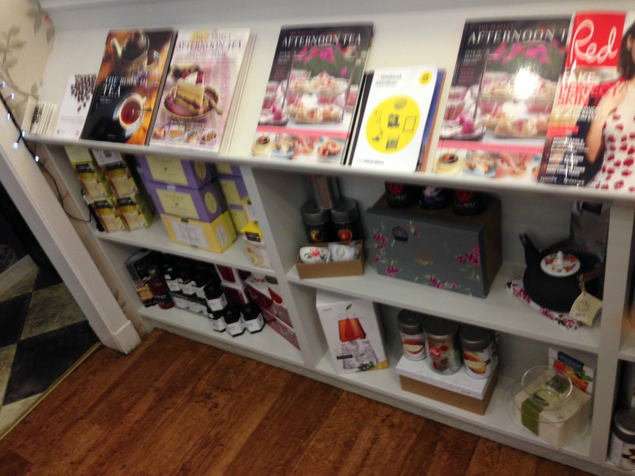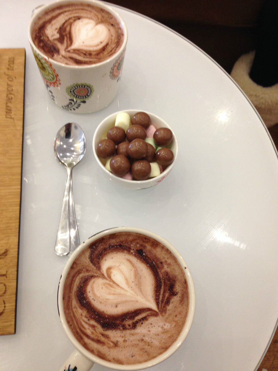 Now for something completely different! As many of you know, my life pretty much revolves around chocolate so you can imagine my delight when I discovered that Cup (little Belmont street ‘tea salon and café’) do a ‘chocolate afternoon tea’ where all components are chocolate-based!! My gorgeous friend Sarah is a fellow chocoholic so I decided to coerce her into joining me (in fairness, not that much coercion was required) – so off to Cup we headed, each with our 8 month old in tow. Firstly, the décor, what fun! It really captures the kitsch / retro / artisan fusion vibe it’s going for – so lovely. Loads of ace details including a feature wall with gorgeous wallpaper, a bookshelf filled with very relevant titles, wooden backed super cute menus and comfy sofas at the back with plenty of space for a rowdy wee boy in a highchair! You can tell absolutely loads of thought has gone into every aspect and in spite of all the neat bits and pieces it isn’t in the slightest bit cluttered – spot on. Surroundings wise, my only criticisms would be that it is too hot (I’ve been a couple of times and it was the same both times) and it’s too humid (steamed up windows in a café are a pet hate of mine – get a dehumidifier pronto!!). So, needless to say, we opted for the chocolate afternoon tea (the lovely waitress offered us the option of sandwiches in place of the nutella toasties if we wanted to tone down the chocolate madness but we didn’t, we were up for the challenge!). We also both went for hot chocolates with maltesers and marshmallows, no cream of course, THAT would have been greedy!